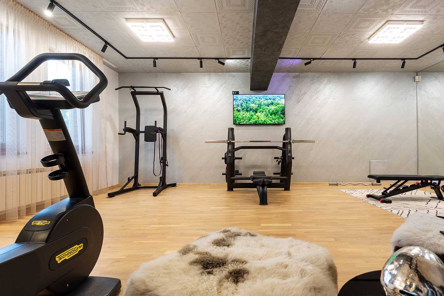 Интериорът е модерен и стилен, с настилка от естествен паркет, която създава усещане за лукс и комфорт. Докато тренирате, можете да се насладите на развлечения и информация чрез 55” Смарт телевизор, който е част от оборудването на залата. Тази фитнес зала е идеална за поддържане на вашата рутина или за начало на нова, предоставяйки ви перфектната среда за постигане на вашите фитнес цели.