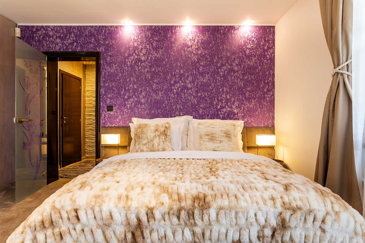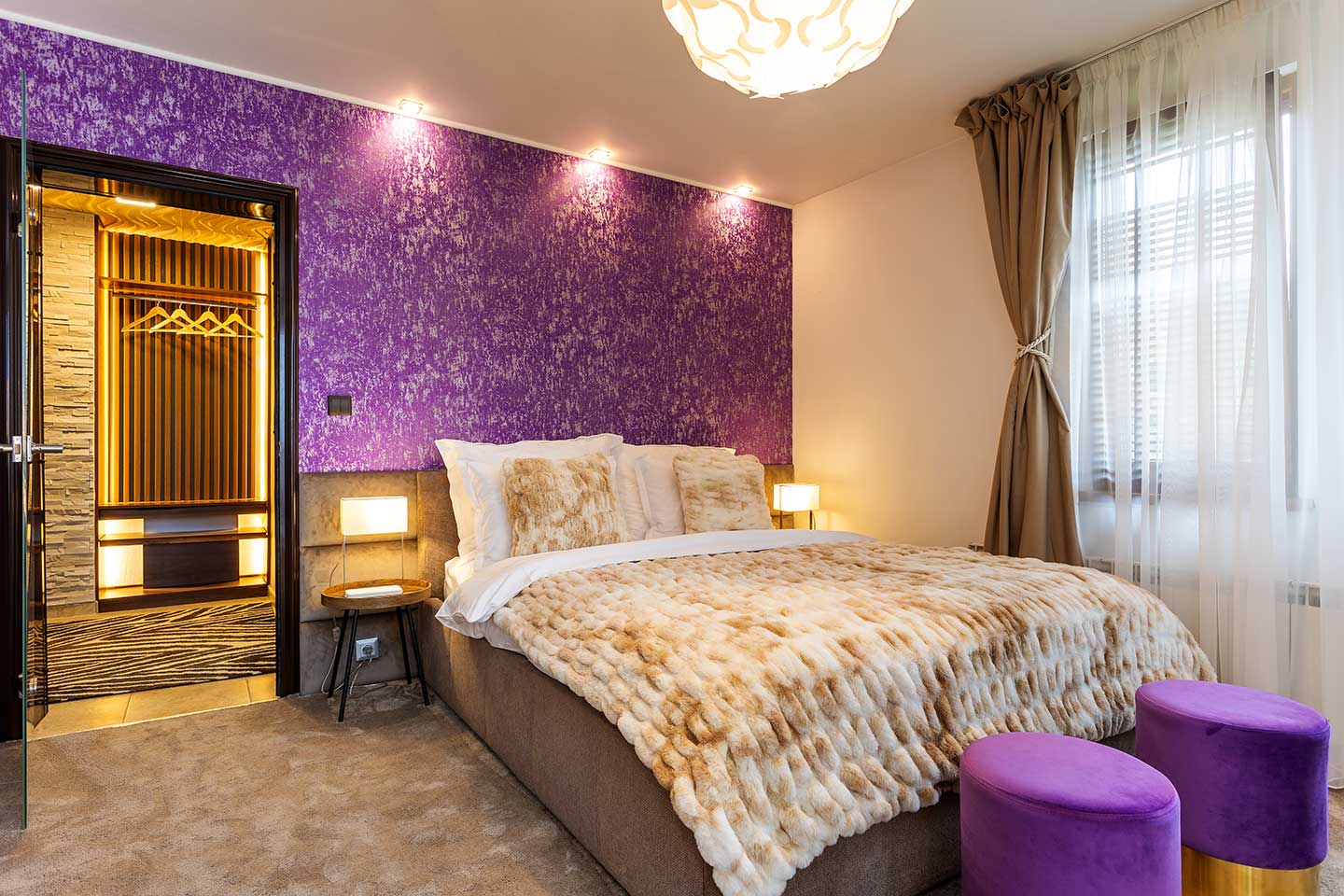 Шик и уют с изразителни акценти. Това е спалня 3 на третия етаж на Villa 1331, която е истинско олицетворение за релакс и стил. С обща площ от 20 кв.м., тази стая предлага уникална комбинация от съвременен комфорт и контрастна привлекателност. Обзаведена е с изискан вкус, подчертан от живописните лилави акценти, които се съчетават хармонично с неутралните тонове в интериора. Мекият мокет допълва усещането за топлина и уют в стаята.