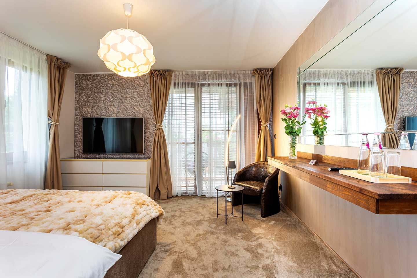 В стаята има удобно двойно легло 160/200 см, оборудвано с висококачествено спално бельо, идеално за двама възрастни. Стаята разполага с модерни удобства като 55-инчов Samsung телевизор, Wi-Fi, Netflix, Apple TV и bbox, които гарантират отлично прекарване и развлечения по всяко време. Кът за работа и етажерка предлагат допълнително уединение, а огледалото, разположено на едната стена, увеличава светлината в стаята и я прави още по-просторна.