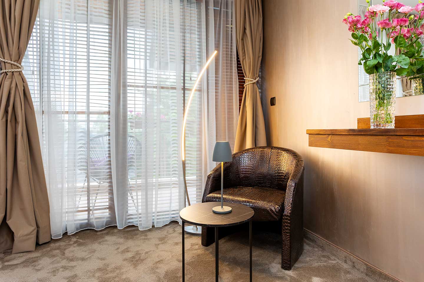 Завесите blackout осигуряват пълна тъмнина за непробуден сън. Терасата предлага великолепни гледки към басейна и Рила планина, идеална за сутрешно кафе или вечерен отдих.