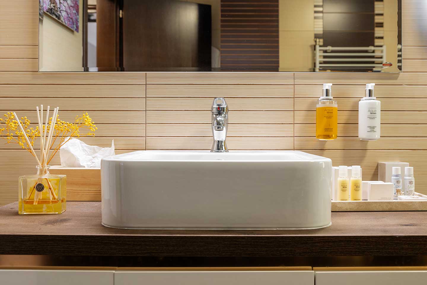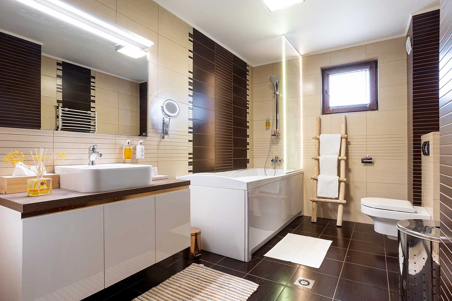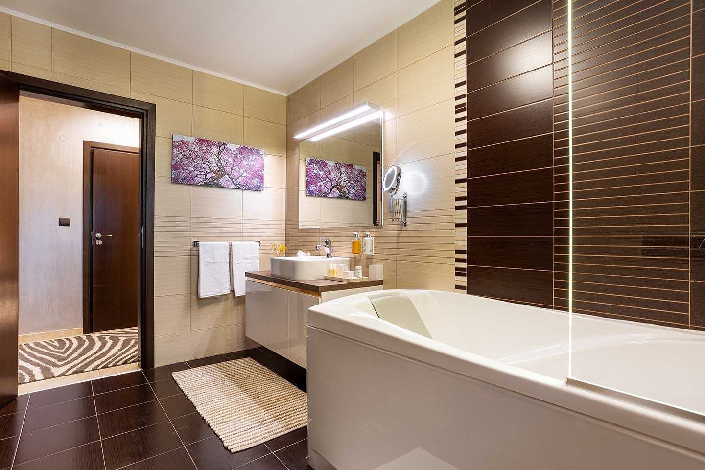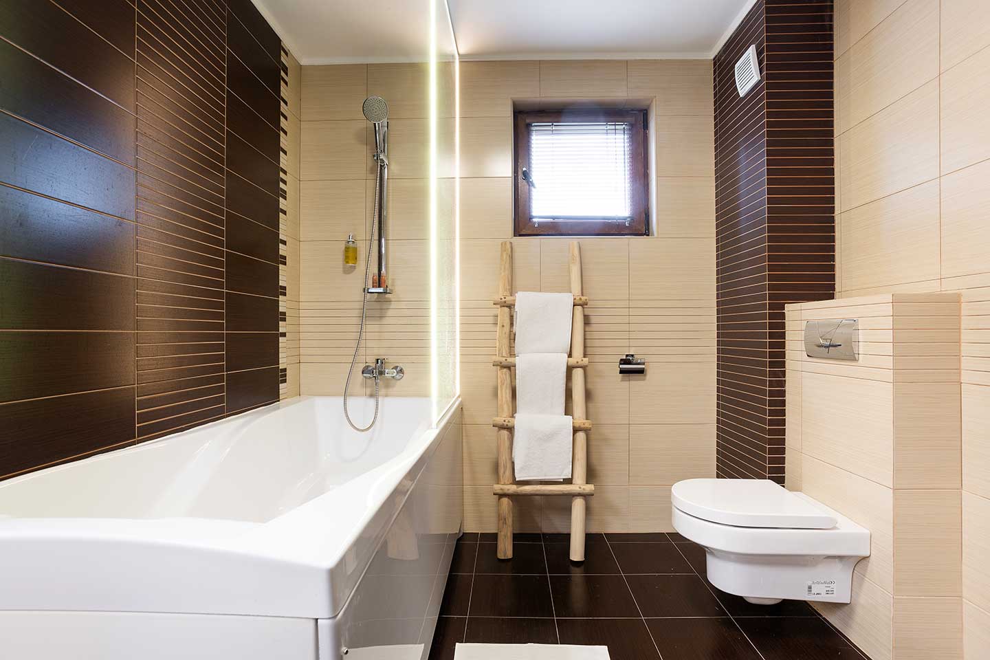 Банята е розкошно пространство от 12 кв.м., предлагащо вана, подово отопление и луксозни тоалетни принадлежности, което допълва усещането за спа удобство в собствения ви дом.